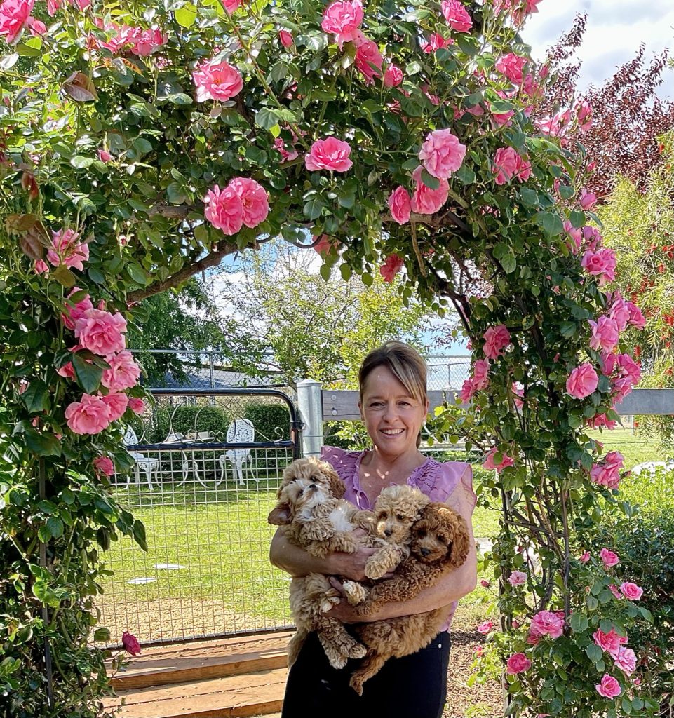 Our property is home to 8 Campdraft horses 10 dogs a couple of cats and one Gpig! We have 15 rolling acres with dog proof perimeter fencing allowing our adult dogs to roam free all day. We have built a fully insulated heated/cooled puppy homestead with surrounding playgrounds protected by elm trees and shade sails where puppies can romp and explore the outdoors. We have a lovely grassed area where families can come and interact with their puppies on pick up or as they grow.